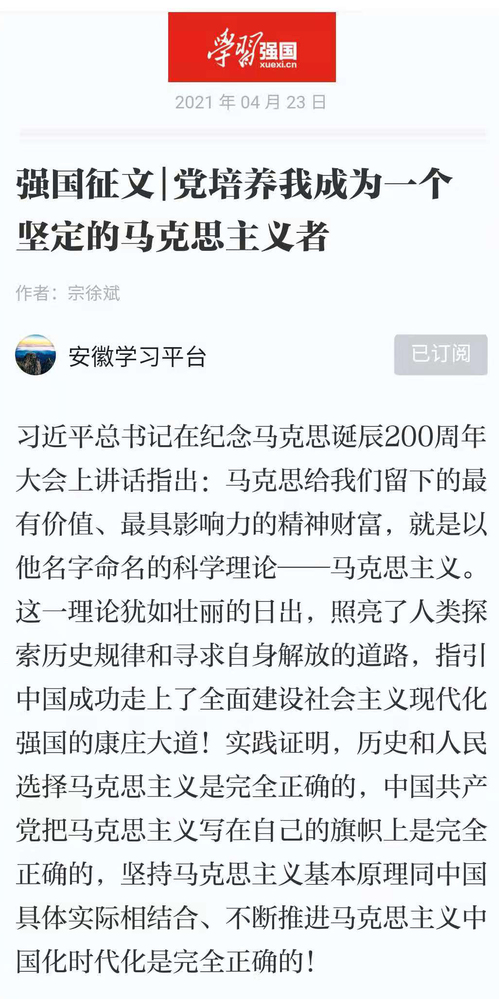 習近平總書記在紀念馬克思誕辰200周年大會上講話指出:馬克思給我們留下的最有價值、最具影響力的精神财富,就是以他名字命名的科學理論——馬克思主義。這一理論猶如壯麗的日出,照亮了人類探索曆史規律和尋求自身解放的道路,指引中國成功走上了全面建設社會主義現代化強國的康莊大道!實踐證明,曆史和人民選擇馬克思主義是完全正确的,中國共産黨把馬克思主義寫在自己的旗幟上是完全正确的,堅持馬克思主義基本原理同中國具體實際相結合、不斷推進馬克思主義中國化時代化是完全正确的!
